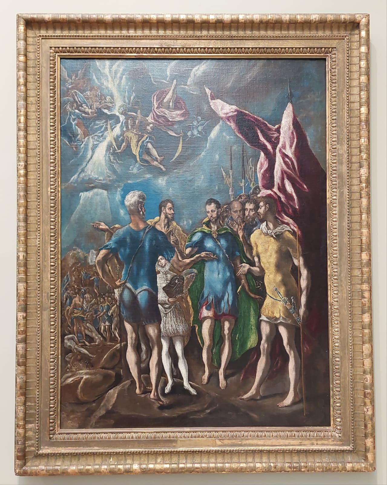 Cel de-al treilea tablou subsumat operei lui El Greco din Muzeul Național de Artă al României, este o replică redusă a uneia dintre lucrările importante realizate de artist în Spania. Este vorba despre comanda adresată de Regele Filip al II-lea în 1580 pentru Escurial, comanda unui tablou reprezentând Martiriul Sfântului Mauriciu și al legiunii tebane. În copia de la București, autorul ei Jorge Manuel simte nevoia să schimbe anumite personaje, figuri, așa încât în interstițiul dintre Sfântul Mauriciu și purtătorul de stindard, se află două chipuri pe care experții în El Greco le consideră a fi autoportretul lui Jorge Manuel, respectiv portretul tatălui său El Greco, ca un fel de omagiu ultim după moarte în relație cu prima operă importantă pe care artistul o pictase în Spania.”