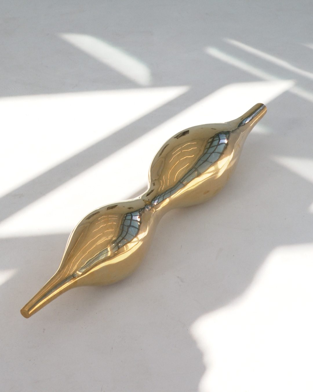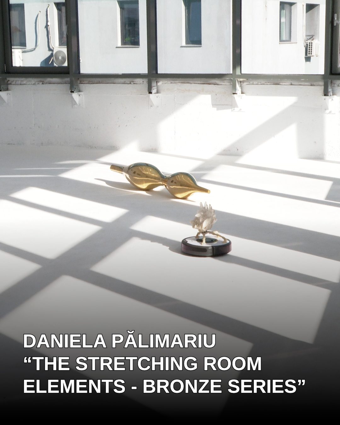 Christian Roncea, curatorul expoziției, ne-a spus povestea sculpturii artistei Daniela Pălimariu: “Este o sculptură din bronz și face parte dintr-o serie de sculpturi care au fost expuse public într-un fel de parc – “The Stretching Room”. Spre deosebire de celelalte lucrări care sunt flexibile, sunt din rășină și sunt activate de oameni, aici avem lucrarea într-o fază de repaus. Prin greutatea ei, dar și prin textura lucioasă creează o antiteză cu celelalte sculpturi pe care oamenii le activează. În cazul acesta oamenii sunt în oglindă.”