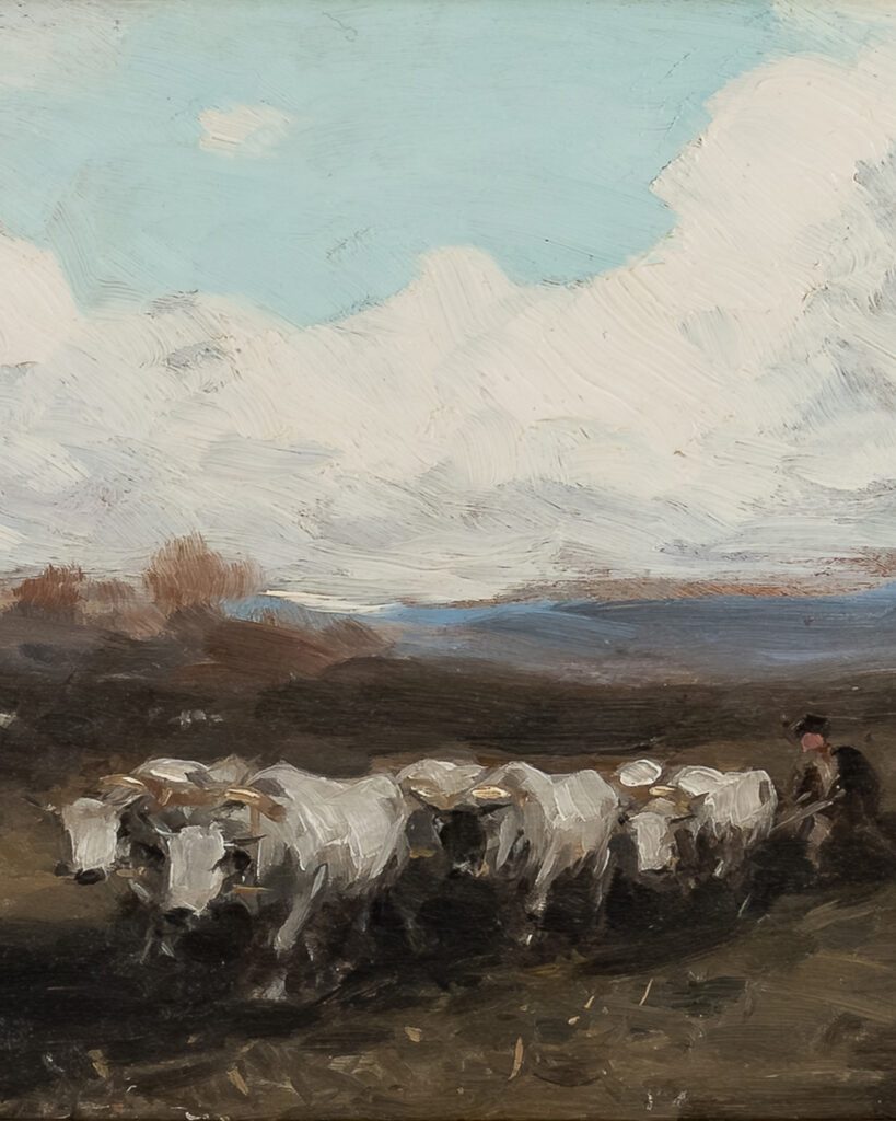 Curatorul Mariana Cîmpeanu ne dezvăluie: “În fiecare colț de natură se ascunde o poveste, iar pictura o face vizibilă. Nicolae Grigorescu surprinde cu o sensibilitate aparte ritmul firesc al unei zile petrecute în mijlocul naturii. În lucrarea “Plugul cu boi”, pictorul prezintă o dimineață liniștită pe câmp, unde lumina rece și palidă a zorilor se așterne peste pământul reavăn. Cerul vast care ocupă o mare parte a compoziției, oferă picturii un efect de monumentalitate.