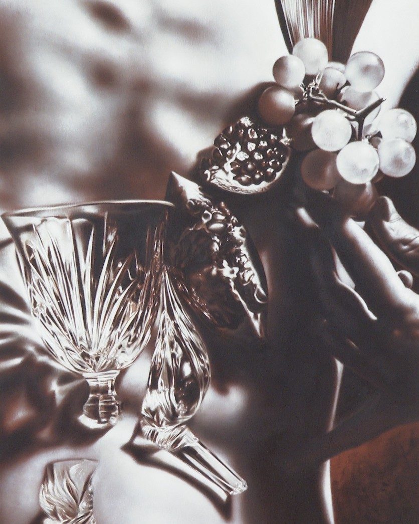 Curatorul Christian Roncea ne-a prezentat ideea expoziției THE FANTASTIC BELT: “Am selectat niște artiști care eu consider că reprezintă o nouă formă de artă sau un nou movement, care s-ar numi “Vampire Renaissance”. E de fapt o formă de a permite vizitatorului să intre într-o poveste fantastică. Începem prezentarea expoziției cu artistul Andrei Nițu, născut în anul 2000. Andrei mi-a zis că fiecare portret pe care îl pictează cumva se focusează pe trauma care i s-a dat și trauma care poate o face mai departe, un fel de ciclu vicios al răului. El fotografiază fiecare persoană pe care o pictează și în același timp folosește elemente pe care le tot repetă cum ar fi paharul, rodia și strugurii. Sunt niște elemente primare și foarte senzuale, care au legătură și cu moartea și cu viața în același timp.